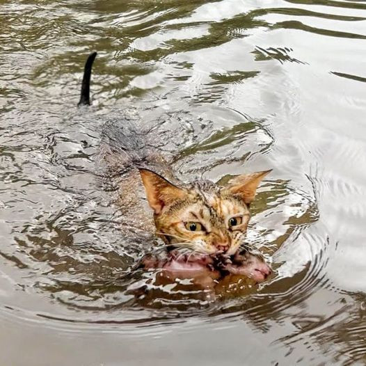 Steeling herself against the storm’s fury, Bella made a bold decision—she would carry her kitten through the flood to safety.