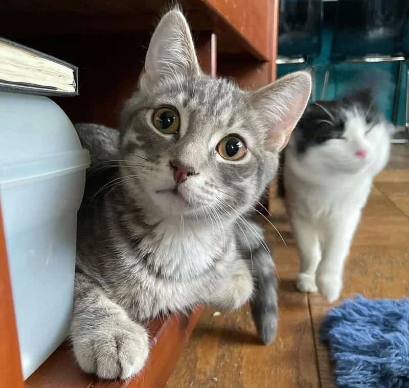 Among the other cats was DJ Mittens, who is a bit wobbly. Jardani often showed affection by wrapping his arm around him and thoroughly washing his face. He also took Monchichi under his wing, showcasing his impressive swiping skills and high jumps.