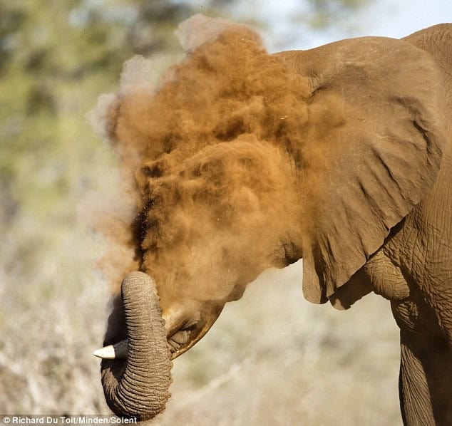 An elephant in South Africa’s Kruger National Park was spotted keeping cool in a creative way—by throwing dust and sand over itself.