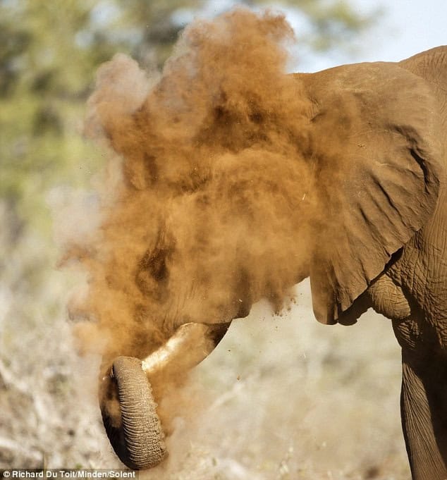 After a brief pause, the elephant tossed up another cloud of sand, giving du Toit the perfect shot. “I was thrilled to capture this sequence,” he shared, describing the animal’s calm demeanor as it continued, seemingly unaware of du Toit’s presence.