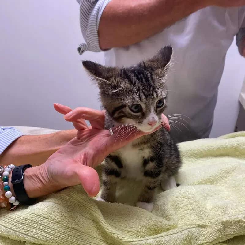 Named Claudie, the kitten was in dire condition, malnourished, and weighed barely a pound. Though visibly shaken from her experience, she quickly began eating the food provided.