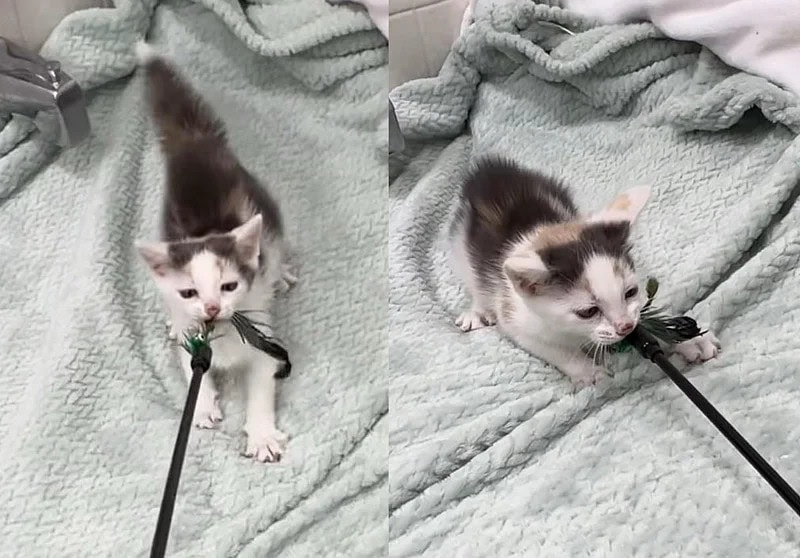 Ellen introduced new toys, but Caramel was particularly fascinated by a feather wand. She would leap and grab it while letting out playful growls as Ellen tugged at the other end.