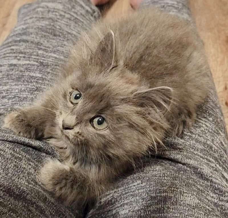 Despite being flea-infested, dehydrated, and slightly lethargic, the kitten insisted on staying close to people. After receiving treatment and a good cleaning, he relaxed in a warm lap, purring contentedly.
