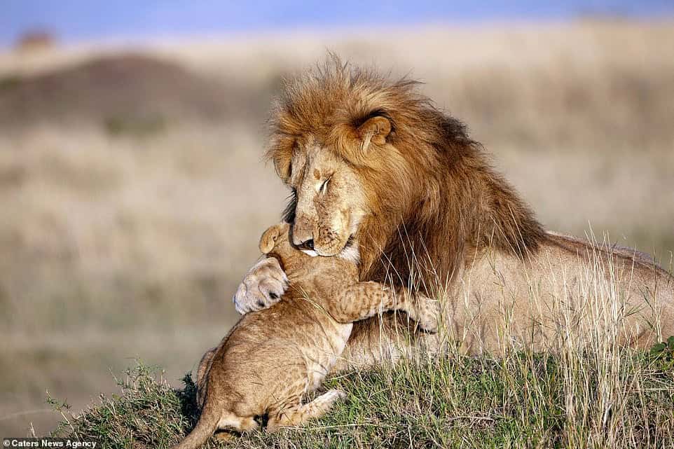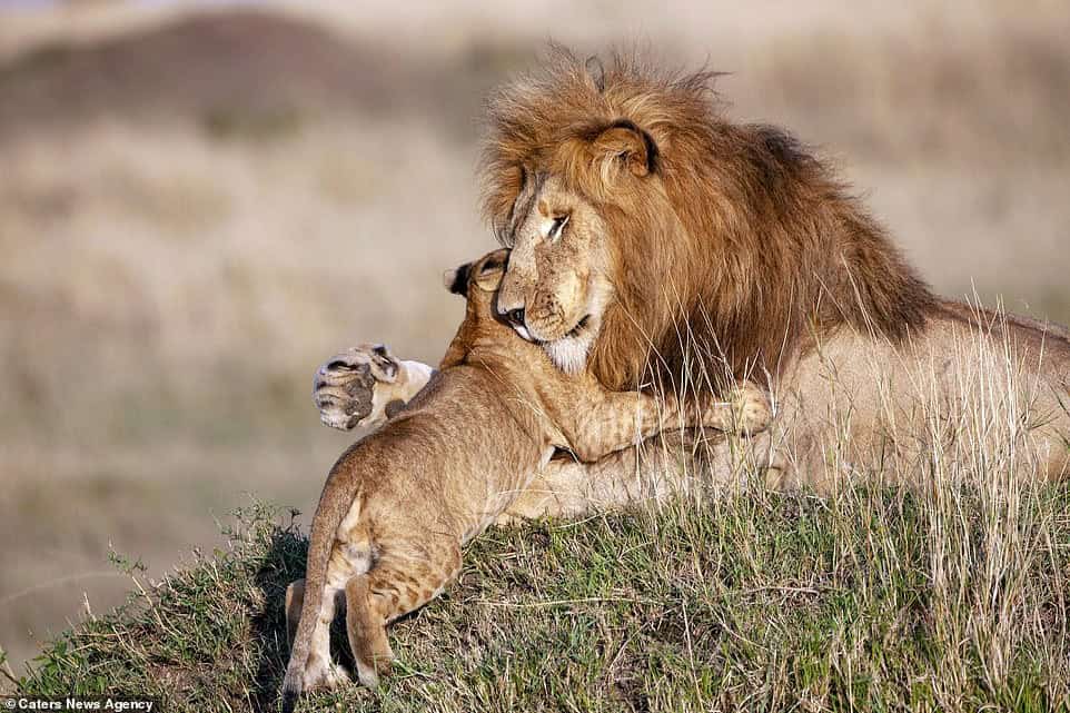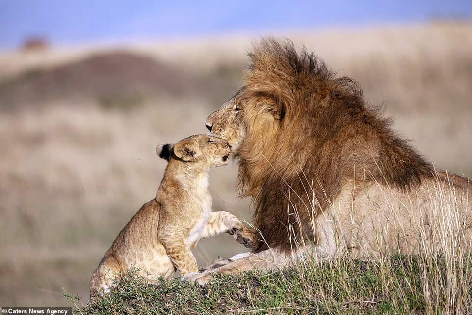 Against the backdrop of the African sunrise, the father lion’s affectionate embrace embodied a pure moment of grace and tenderness.