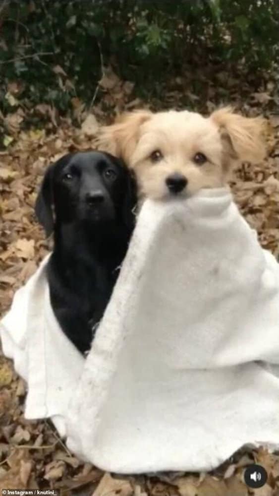 On a crisp autumn day in Hamburg, Germany, Knut, a charming Pomeranian mix, is nestled under a cozy white blanket amidst the fallen leaves, wrapping his tiny paws around his companion, Pauli, the sausage dog.
