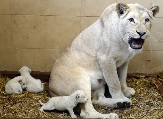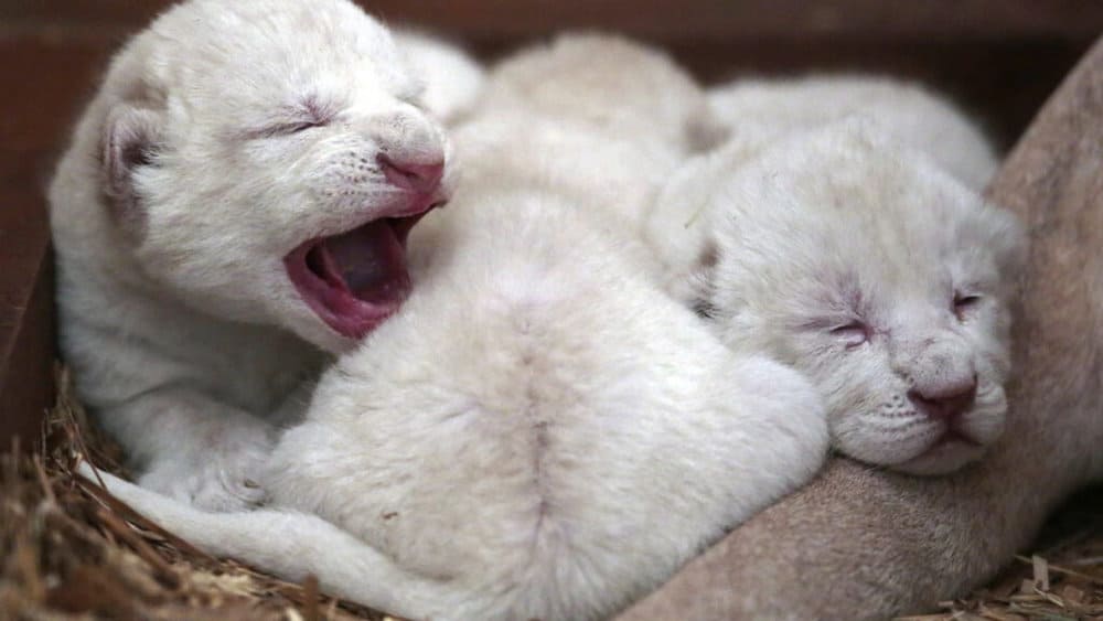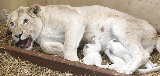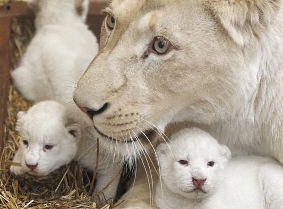 In central Poland, the owner of a private zoo is overjoyed with the arrival of three rare white lion cubs, who are receiving tender care from their mother.