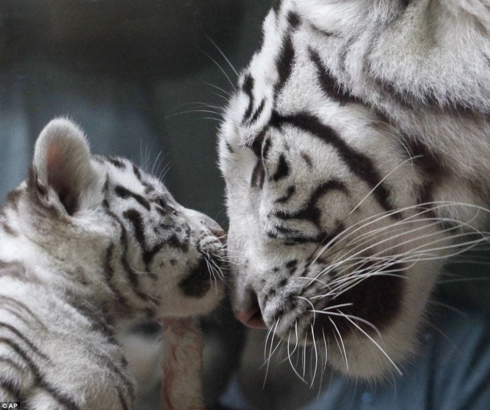 Mother and cub: White Bengal tigers are only born one in every 10,000, so triplets born to mother Surya Bara at in a Czech Republic zoo are a cute, black and white miracle