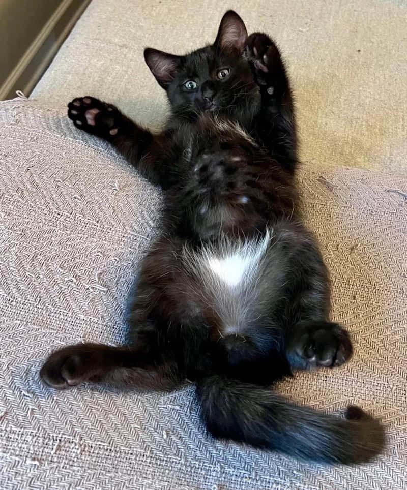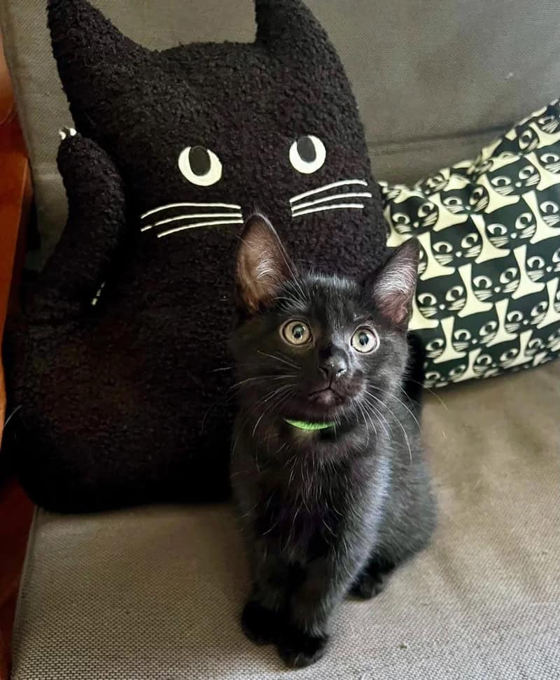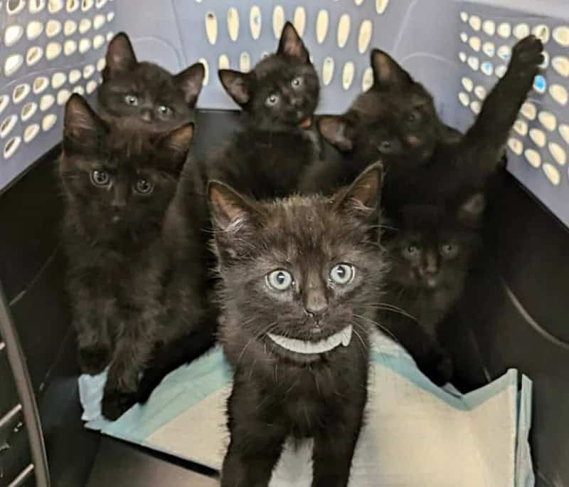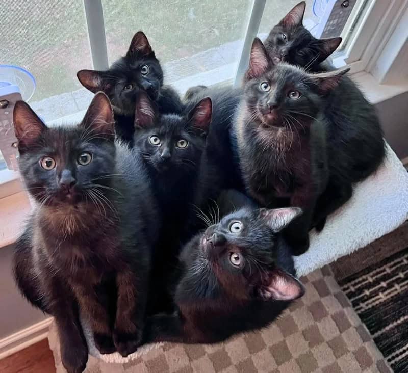 Her six “void” kittens, all black like their mother, became lively little look-alikes, leading Aimee to joke that Jazz had “hit copy-paste” on her offspring.
