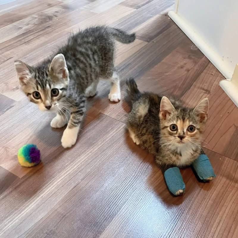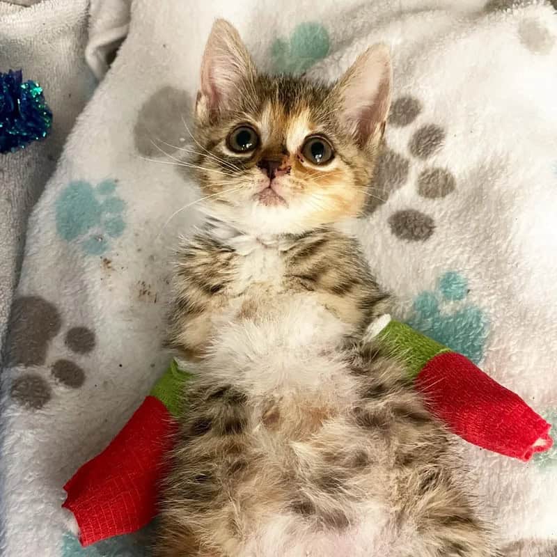 The splints didn’t bother Poppy; she often lay on her back, exposing her belly. After a week of treatment, the staff observed significant healing in her legs and decided to let her play with another kitten. Poppy quickly charmed everyone she met, both human and feline.
